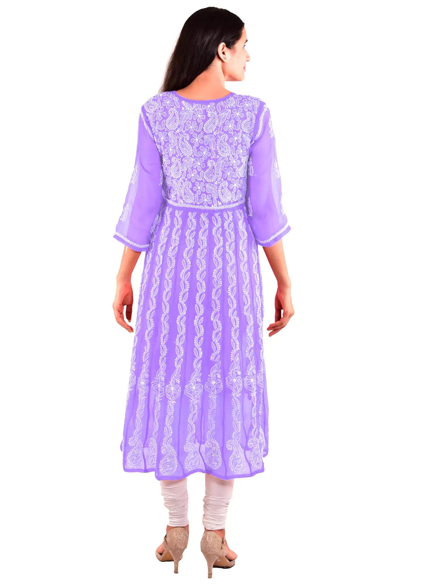 The ethnic look is back in vogue with this Hand Embroidered Lucknow Chikankari Georgette 22 Kali Anarkali Kurti represents a fusion of modern style and traditional look. The Georgette fabric keeps you cool and comfortable throughout the day. Step out with this trendy Georgette Chikankari Anarkali Kurti by wearing it with full grace and style. The fabric is comfortable in wearing and easily washable.