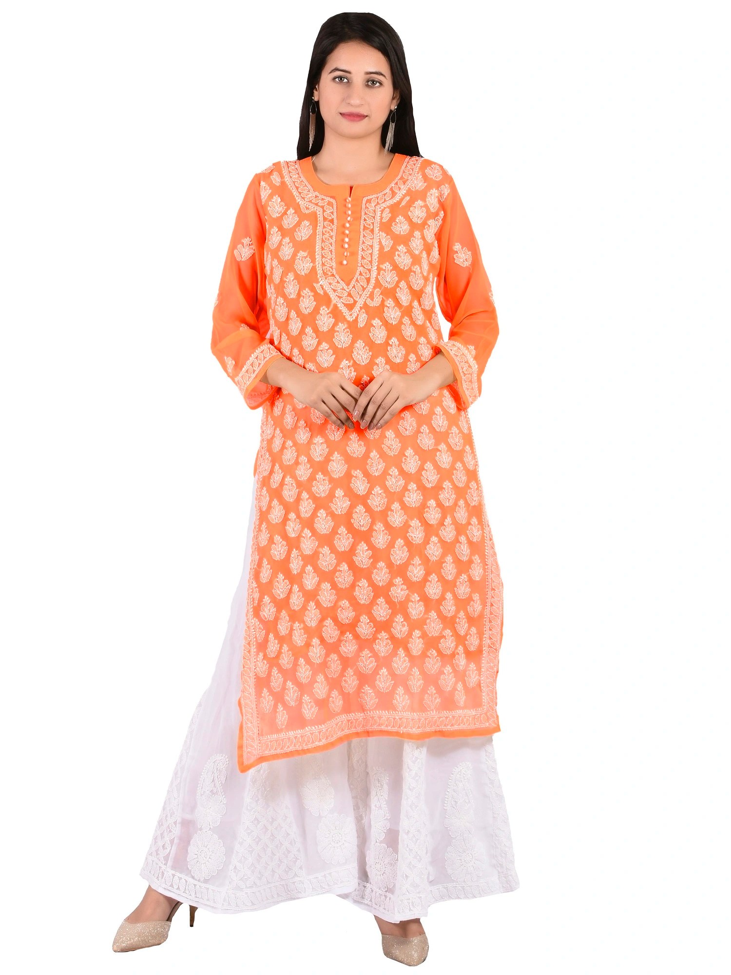 Offering a Comfortable fit and exhibiting a subtle appeal, this Lucknow Chikankari Orange Allover Booti Jaal Faux Georgette Kurti in various solid colours from LAVANGI are something you can’t give a miss.